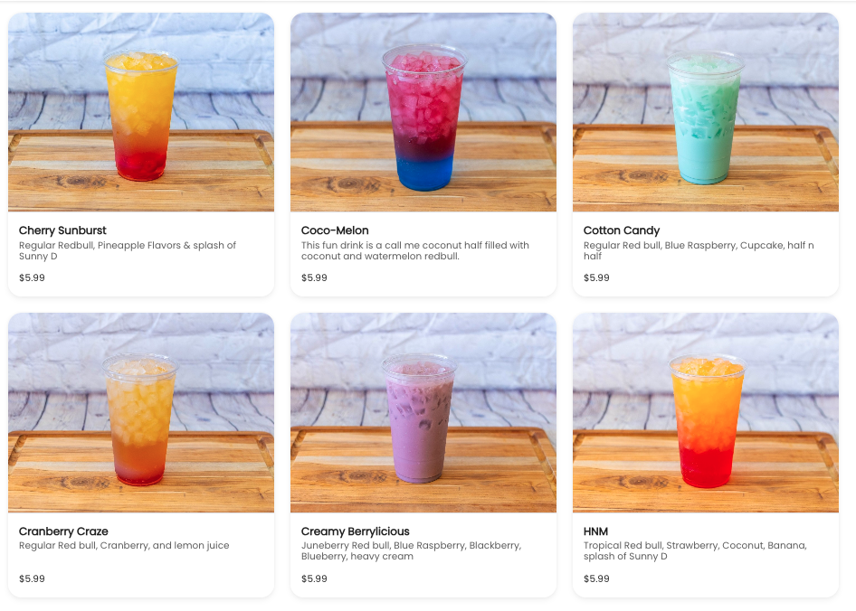 Artesia's favorite. Regular Redbull with hints of strawberry, coconut, pineapple, and a splash of sunny D.