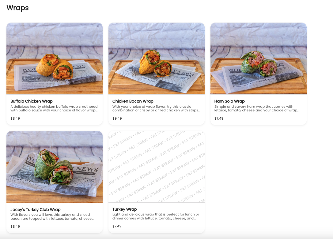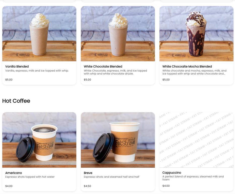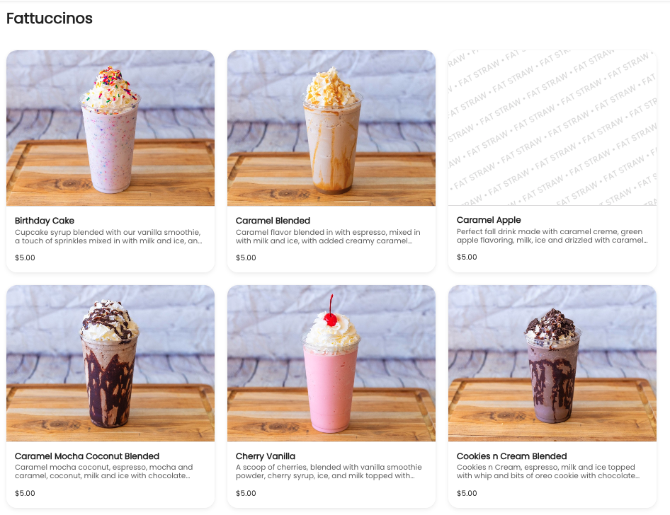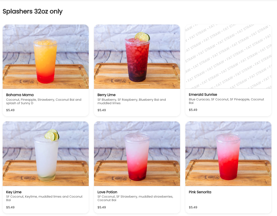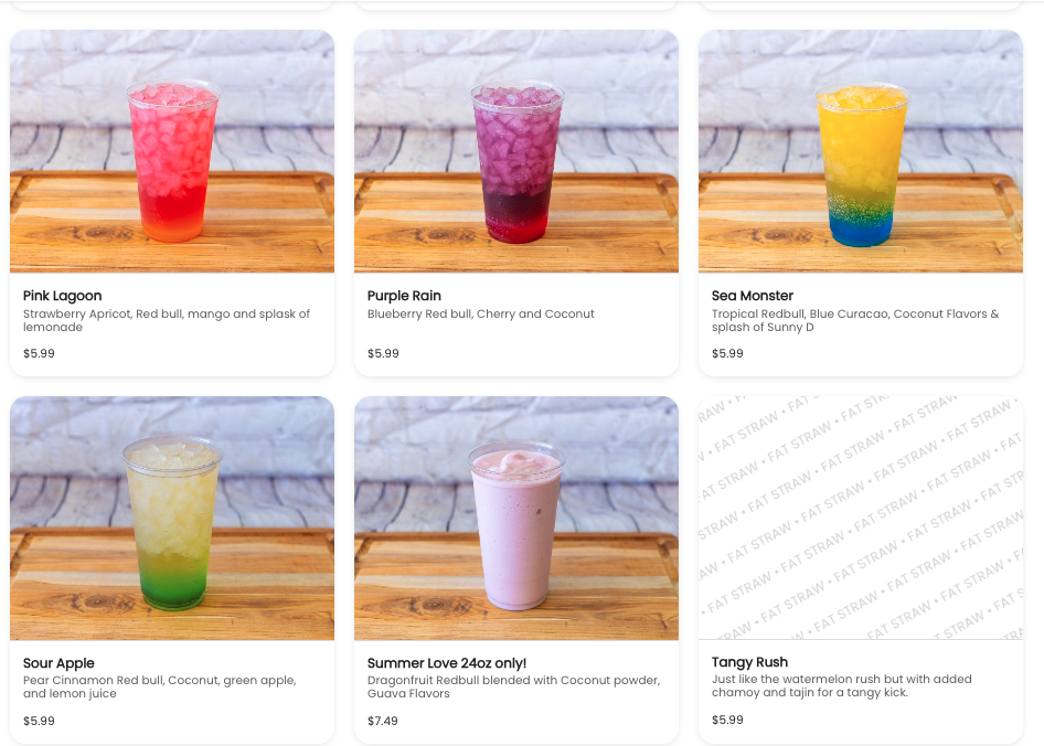 Fat Straw Drinks offers a diverse menu that caters to a wide range of tastes, perfect for any time of the day. For coffee lovers, there's a variety of options such as Mocha Blended and Caramel Mocha Coconut Blended under the Fattuccinos, along with Iced Americano and Cappuccino. Their bubble tea selection includes favorites like Green Bubble Tea and Thai Bubble Tea, while tea enthusiasts can enjoy beverages like Iced Thai Tea and Hot Tea. For a refreshing twist, you can also try their Tropical Smoothie or Mango Madness from the Real Fruit Smoothies section. If you're looking for something savory, their wraps, such as the Ham Solo Wrap and Buffalo Chicken Wrap, are satisfying, available from 10:30 am to 1:45 pm. They also offer hearty options like Chicken Tenders and Mozzarella Sticks. The breakfast menu, available until 10 am, includes delicious Bacon Burritos and Chorizo Bowls. Don't miss their signature drinks like the Emerald Sunrise or the Bulldog Sunrise Red Bull drinks, or for a sweet treat, try the Caramel Funnel Cake Fries. The menu also includes lighter options like Caesar Salad Combo and refreshing Flavoured Water. Whether you're in the mood for something indulgent or healthy, Fat Straw Drinks has something to satisfy every craving.