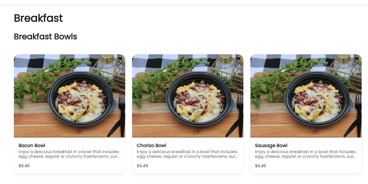 Breakfast bowls include egg, hashbrown, Monterrey jack cheese, fatty sauce and sausage.